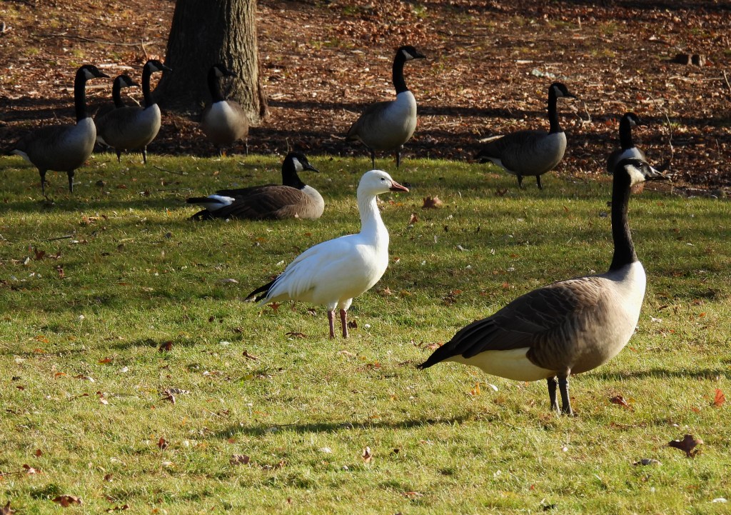 As I walk, a blue jay shrieks somewhere. A raptor circles in the distance, barely visible against the late afternoon sun. My eyes fall to the Canada geese blanketing the field. That’s when I see it: a flash of white. There is an interloper in the flock.